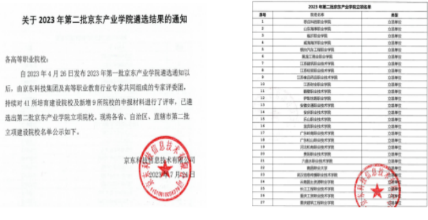 2023年7月第二批京东产业学院立项单位名单正式发布。经过院校申报、项目初评、综合答辩、专家评审等程序,我校凭借其在教学品质、校企合作等方面的突出表现成功入围全国百所重点建设京东产业学院,立项与京东集团共建“数字商业产业学院”。