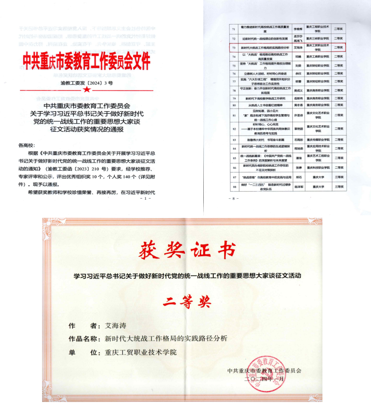 近日,中共重庆市委教育工作委员会通报了关于学习习近平总书记关于做好新时代党的统一战线工作的重要思想大家谈征文活动的获奖情况(渝教工委发〔2024〕3号),艾海涛书记的《新时代大统战工作格局的实践路径分析》作品,获得个人二等奖。