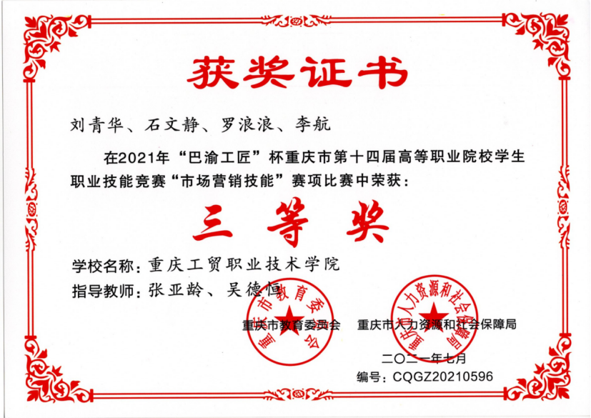 上一条:2021年“巴渝工匠杯”重庆市第十四届高等职业院校学生生职业技能竞赛“市场营销技能“赛项 三等奖获奖证书2