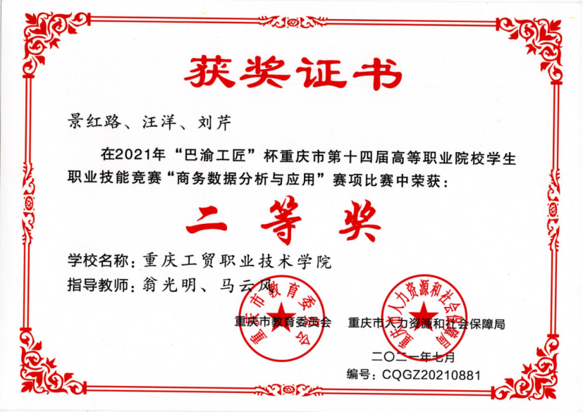 下一条:2021年“巴渝工匠杯”重庆市第十四届高等职业院校学生生职业技能竞赛“商务数据分析与应用“赛项 三等奖获奖证书1