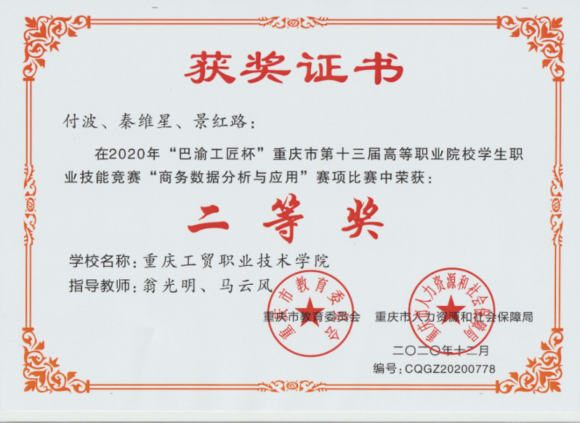 2020年“巴渝工匠杯”重庆市第十三届高等职业院校学生职业技能竞赛“商务数据分析与应用”赛项二等奖获奖证书