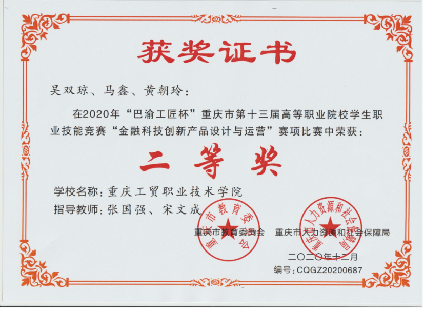 2020年“巴渝工匠杯”重庆市第十三届高等职业院校学生职业技能竞赛“金融科技创新产品设计与运营”赛项二等奖获奖证书