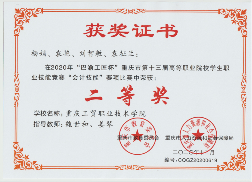 2020年“巴渝工匠杯”重庆市第十三届高等职业院校学生职业技能竞赛“会计技能”赛项二等奖获奖证书