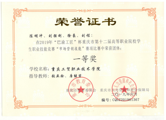 2019年“巴渝工匠”杯重庆市第十二届高等职业院校学生职业技能竞赛“市场营销技能”赛项团体一等奖
