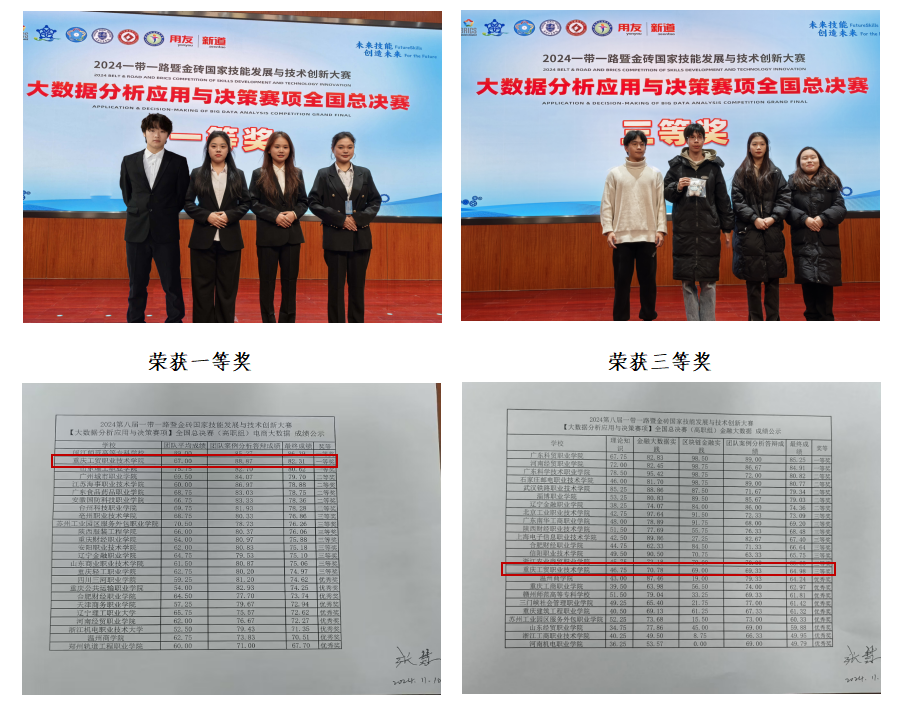 全国总决赛于11月8-10日在辽宁金融职业学院隆重举办。来自一带一路沿线国家和金砖国家的众多顶尖选手齐聚一堂,共同展开了一场智慧与技能的巅峰对决。我院学生钟晓阳、付晶晶、朱雪琴、王芹等4名学生组成的代表队在全国总决赛中荣获团体一等奖(指导老师:胡籍尹、谢林志),李兆雪、简佳静、戴捷丁、夏坤等4名学生组成的代表队荣获团体三等奖(指导老师:宋文成、刘思妤),再次为我校赢得了荣誉。