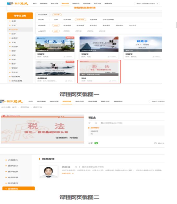 在“新华思政”面向全国各高校征集优质课程思政案例课资源时,我院积极响应学校的号召,安排落实大数据与会计专业冉明佳老师通过教学视频、教学设计、教学课件和教学说课等四个方面,详细制作《税法》这门课程的课程思政教学资源,并从价值引导、元素挖掘、实施成效等多维度对教学资源进行说明,目前该课程的课程思政资源已经展示在新华网“新华思政”的平台上。