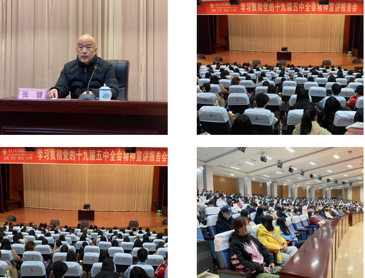 张副院长从五个方面对党的十九届五中全会进行了宣讲:一是关于这次全会的重要意义;二是关于全面把握新发展阶段;三是关于准确领会2035年远景目标和“十四五”时期我国发展的指导方针、主要目标、重点任务;四是关于深刻认识构建新发展格局;五是关于坚持党的全面领导,动员各方面力量为实现“十四五”规划和2035年远景目标而团结奋斗。强调,要把学习宣传贯彻党的十九届五中全会精神作为重要政治任务,切实把思想和行动统一到党中央决策部署上来。要准确把握新发展阶段是承载现代化目标的阶段,是迈向高质量发展的阶段,是构建新发展格局的阶段,必须贯彻新发展理念,走高质量发展之路。希望广大师生找准个人奋斗着力点,在国家发展大局中实现个人价值,为新时代现代化建设贡献智慧和力量,为学院的优质高职院校建设和“双高”申报工作出策出力 。