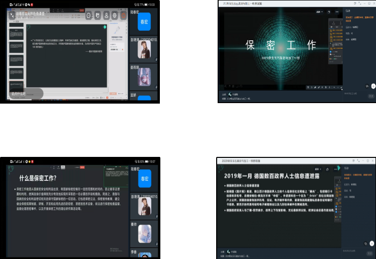 此次班会活动以线上形式开展,借助钉钉平台开展直播。各班级主讲人通过播放PPT,向同学们讲解了保密工作的意义,告诫同学们要牢固树立保密意识,学习保密知识,掌握保密常识,做到内化于心,外化于行;要加强保密行为自律,认清形势,恪守使命,养成自觉维护保守国家秘密安全的习惯;要做好保密防护提醒,对自己的家人和朋友中的公职人员,要时刻提醒他们严格遵守保密纪律。在活动中,各班级主讲人还例举了一些有关信息泄露的案例,使同学们认识到了泄露国家秘密的危险性以及信息泄露造成的严重后果。