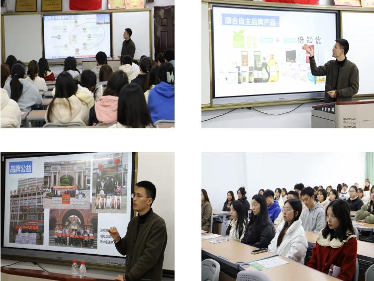 首先,主讲人为现场同学们介绍了该公司业务范围。该公司是一家专注于健康产业链运营与投资的生态型集团,秉承从原料到餐桌、从商品到服务、从线上到线下的理念,致力于为用户提供一站式的大健康管理服务。接着,主讲人通过PPT的形式简要介绍了公司的规章制度、福利待遇、企业文化、现有产业结构、组织构架和人力资源政策等方面。