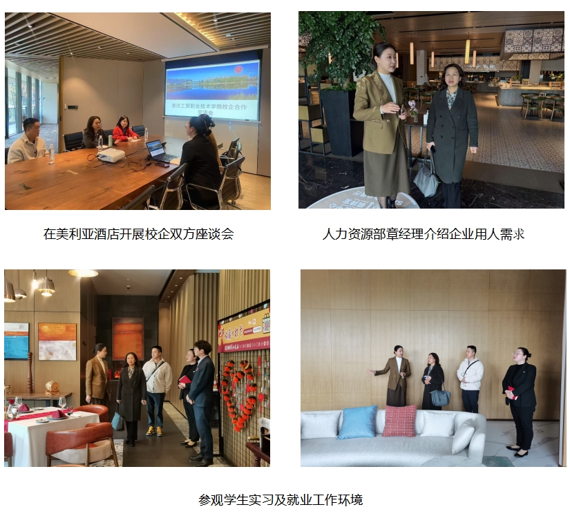 下午,在渝州宾馆,人力资源总监邱总、副总监阮总、招聘经理许海燕、培训经理田念书首先带领yl7703永利官网唐院长一行参观了酒店,介绍了酒店的发展现状及用人需求,在参观过程中,唐院长带领李丹等专业教师回访了在酒店就业的毕业生。随后的座谈会中,企业对数字化、信息化及学生吃苦耐劳等诸方面的能力培养提出了建议,唐院长就2025年的毕业生就业需求、岗课融通学习做了介绍,同时对企业多年来对我院学生实习实训及就业的支持表示感谢,接下来双方将继续开展更深度的合作。